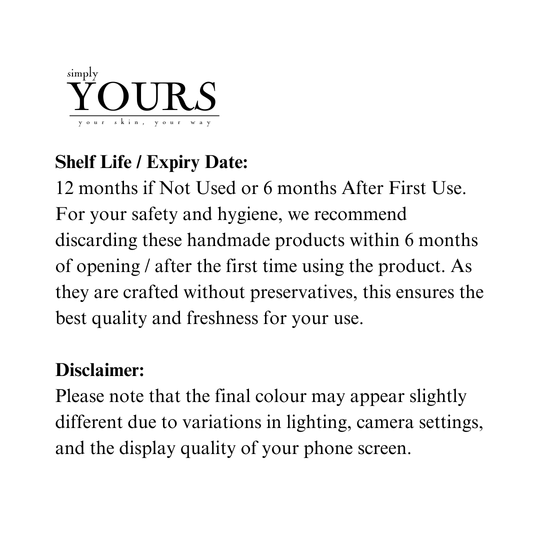 For your safety and hygiene, we recommend discarding these handmade products within 6 months of opening / after first time using the product. As they are crafted without preservatives, this ensures the best quality and freshness for your use.